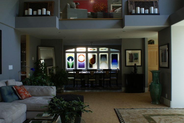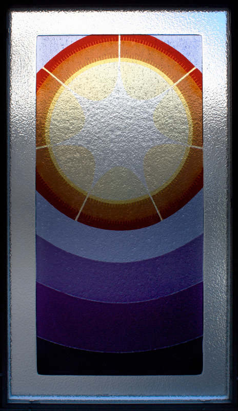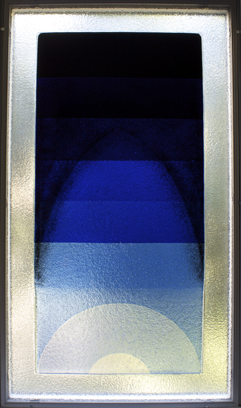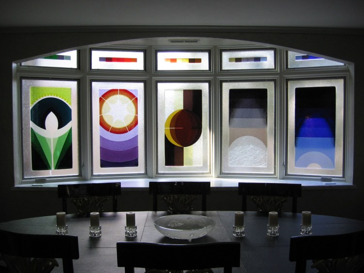 This series of windows, called The Shen Cycle, is in a private home in Minneapolis. It is a visual exploration into the Chinese energetic system of the five elements. The sequence is the seasonal transformations in nature, in creativity, and in life–from birth to death. The large panels represent the Chinese elements of wood/spring, fire/summer, earth/late summer, metal/autumn, and water/winter. The small transom windows above include the Chinese characters for each respective element.