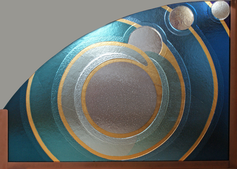 In essence, an architectural installation is a site-specific piece we custom design and create for your space. Each piece is unique because it combines your ideas, the parameters of the project, and our intuitive responses. Some spaces may need a calming influence while others may need a more dynamic energy. In a home or business this art may be solely for its aesthetic presence, or it might have a utilitarian purpose as well. Our most recent accomplishment was a collaborative effort with the North Shore Hospital Auxilliary (above). It is two works 3.5′ X 9′ in kilnworked glass and steel.