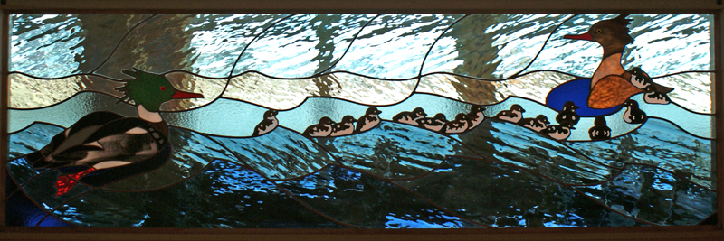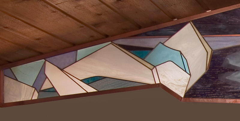 Our first major installation piece arches across the kitchen at the Angry Trout Cafe in Grand Marais. It is over 15′ long and represents major phases of Lake Superior: the icy winter, the calm lake at night with aurora borealis dancing across the surface, and the strong waves of the lake in motion. It is three traditional stained glass panels with copper cane mounted in angle iron covered in sheet copper.