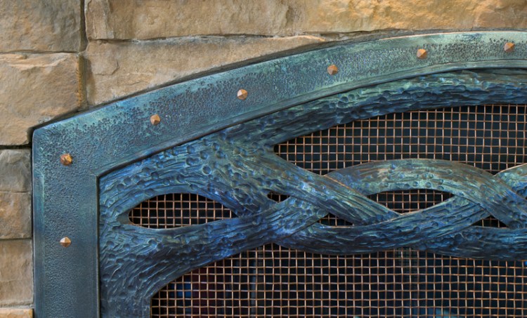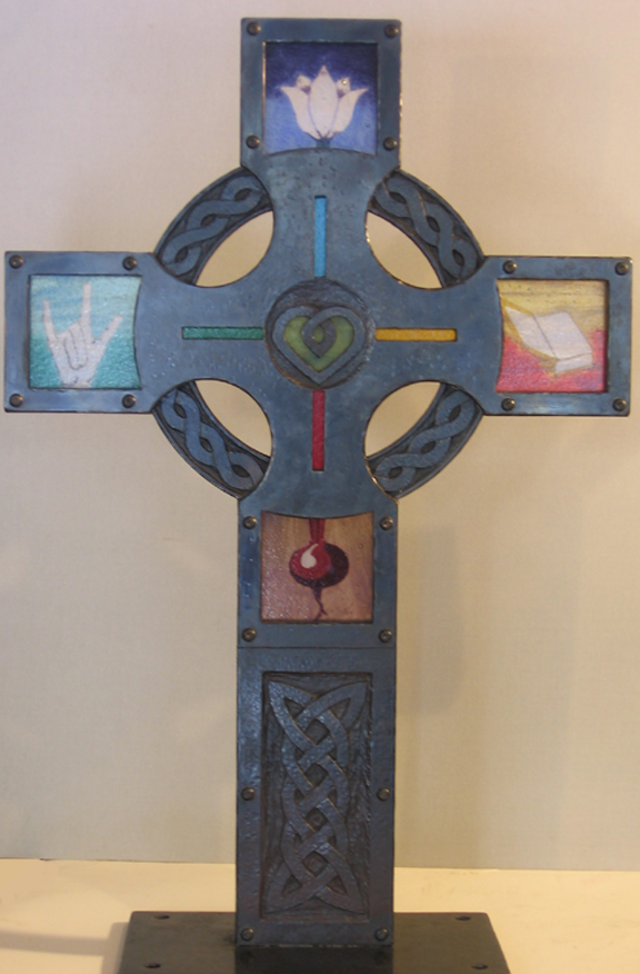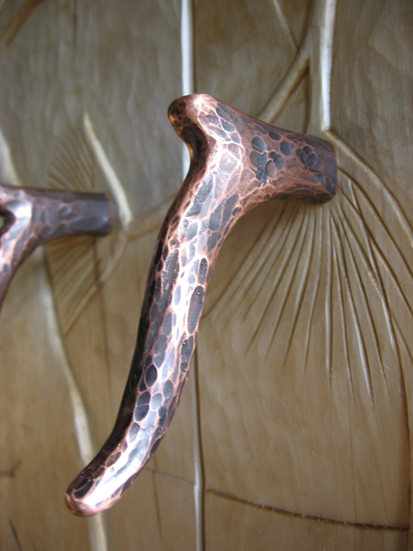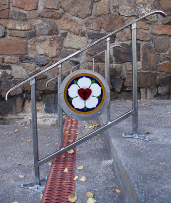 Below are several more of our larger artistic endeavors, including a dalle de verre (slab glass) window and three iron railings installed at Trinity Lutheran Church. There are a forged-iron fireplace screen, a hand-hammered copper fireplace surround, a forged-iron wedding/garden arbor, a set of hand-carved doors with forged-copper pulls, and a cemetery monument of steel and fused-glass which were all done for private parties.
