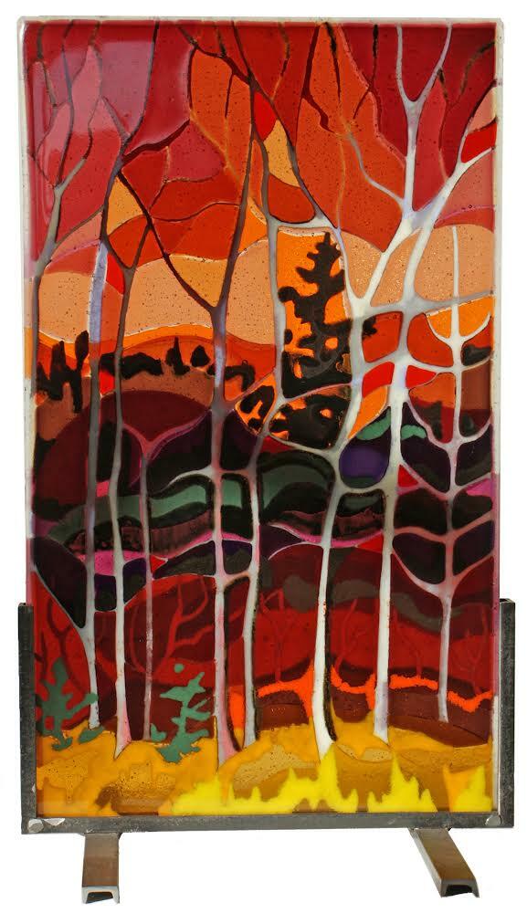Autumn Sunset was created to mimic a favorite oil painting of Sharon’s from the 1980s. She enjoyed experimenting, mixing the colors by layering glass and adding colored powders. Sharon especially likes this because of its vibrancy! Steve created the welded steel stand.