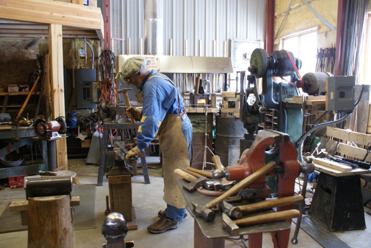 Our studio workspace, like our art, has grown and evolved quite a bit over the years, from the basement, to an addition on the house, and finally to a separate large steel building. This dedicated space houses Steve’s forge and power hammer, Sharon’s kilns and glass in a loft above our gallery, and a room to assemble our larger works together.