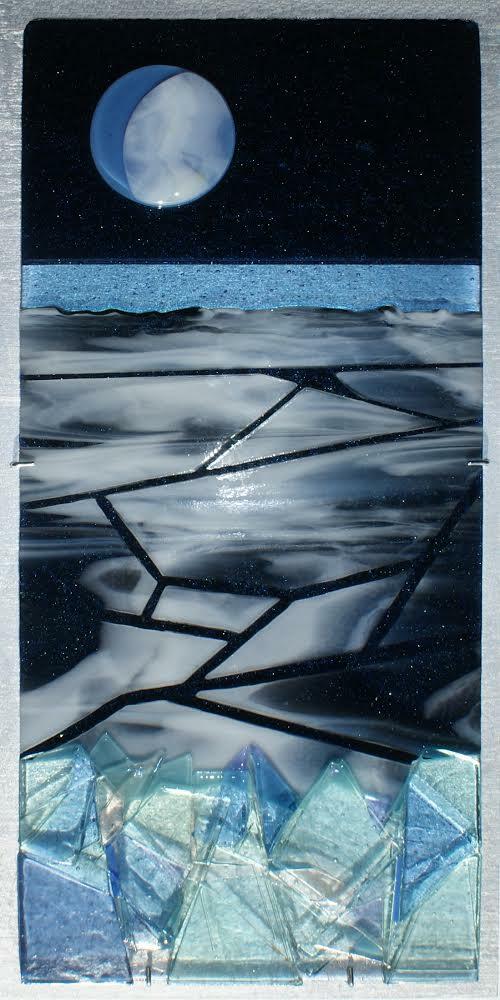 Lake Superior Icescape was a bit of a surprise. Over the course of creating this piece, Sharon’s original concept completely changed through experimentation and an open mind. This piece literally went from day to night, and from a window piece to a wall piece, mounted on a wood panel painted silver. The result is stunning.