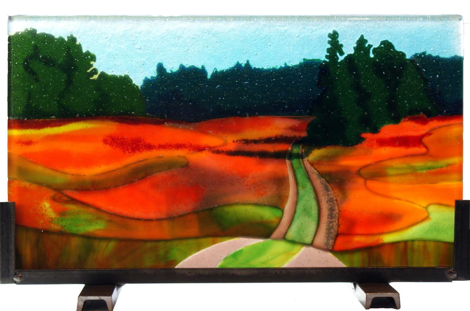 Meadow in Bloom is what Sharon sees mid-summer out of her studio window when the Devil’s Paintbrush cover the Frykmans’ fields in bright orange swaths. The piece is an experiment, layering cut pieces and granulated glass with multiple firings to create depth. Steve created the welded steel stand.